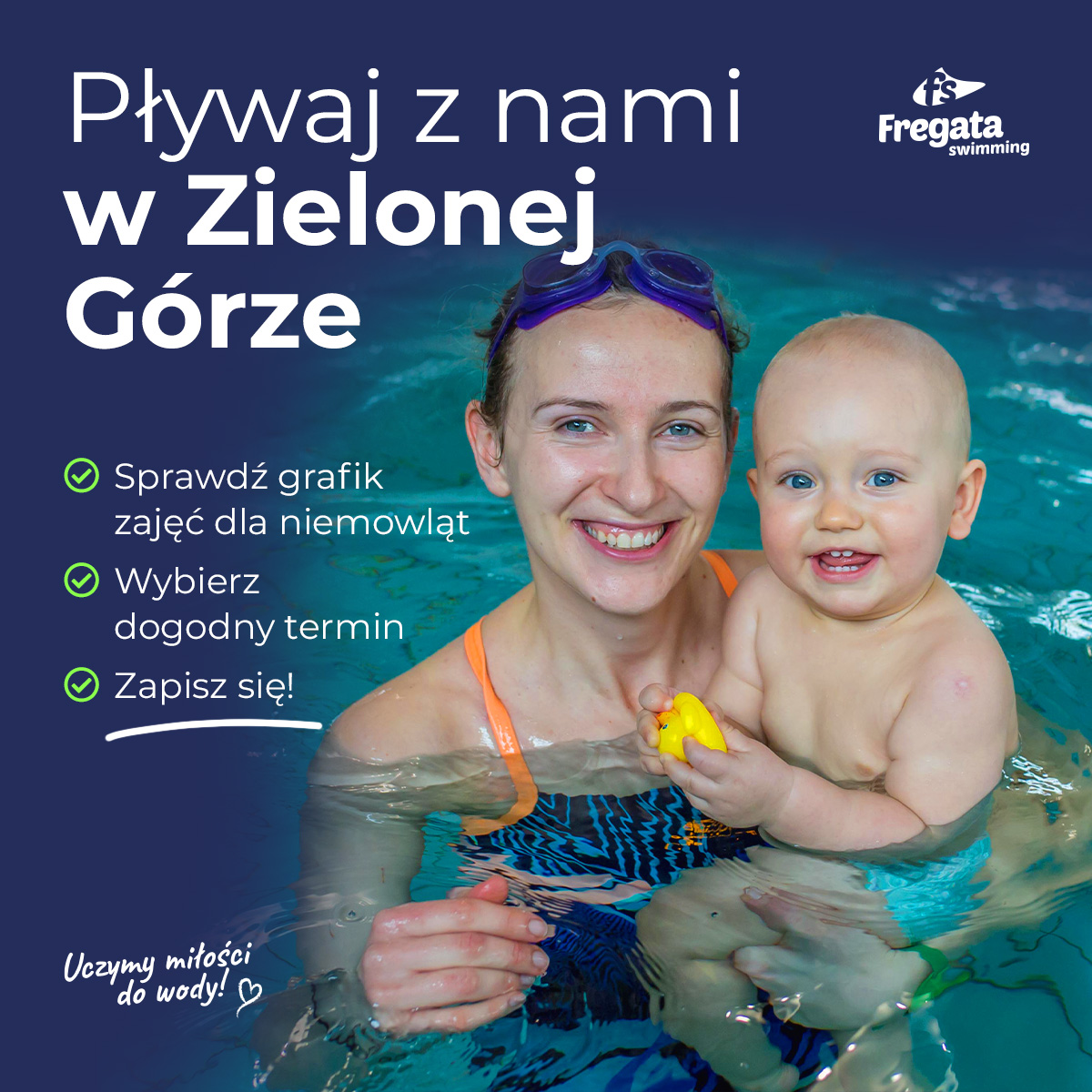 Zapraszamy na nowy semestr zajęć pływania w Zielonej Górze. Podaruj swojemu dziecku bezpieczny, radosny start w wodnym świecie razem z Fregata Swimming! 🌊💛